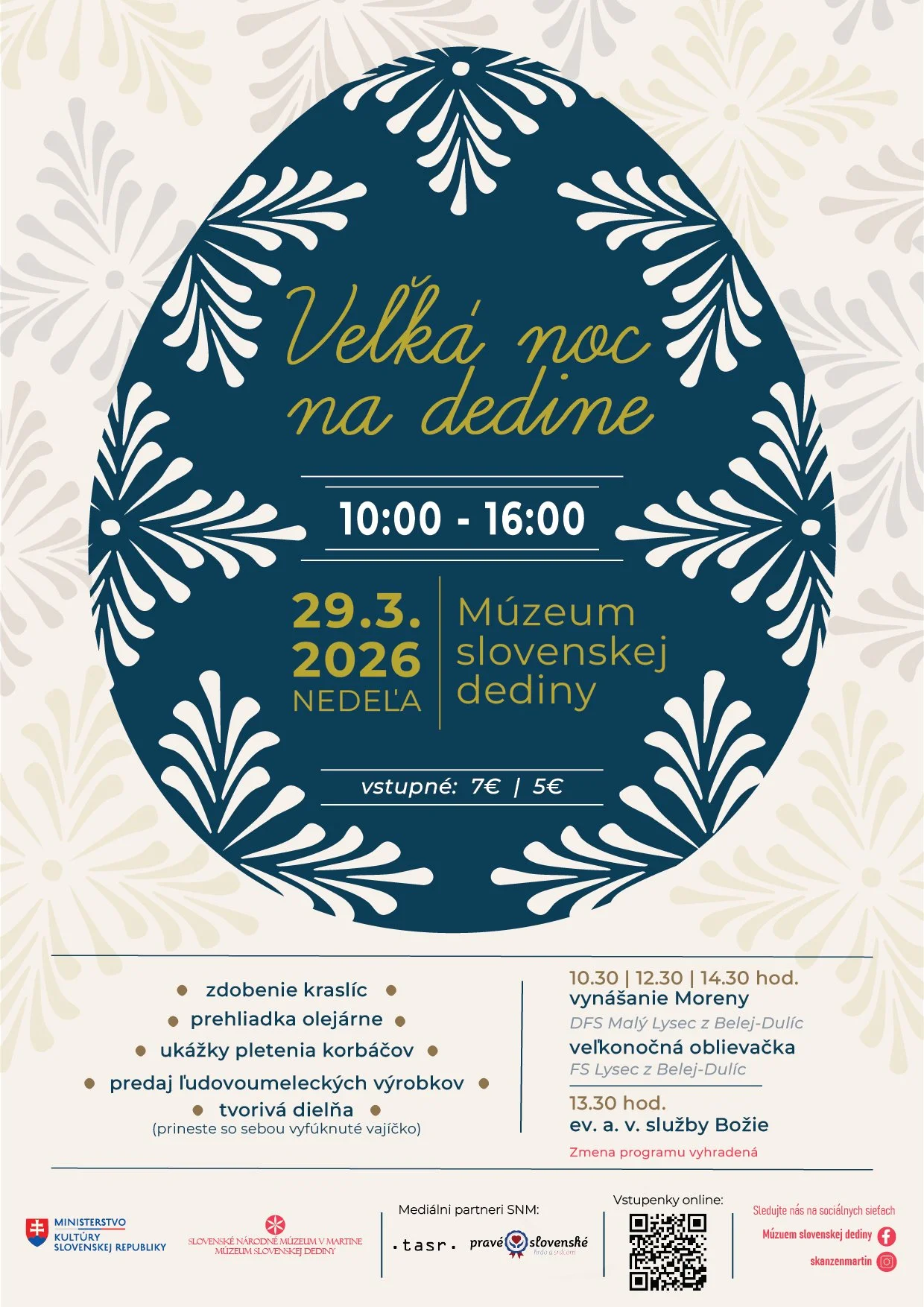 Tradície a zvyky našich predkov, ktoré sprevádzali veľkonočné obdobie, ešte nie sú minulosťou. Zažiť ich môžete v nedeľu 29. marca 2026 od 10.00 do 16.00 hod. v Múzeu slovenskej dediny na podujatí Veľká noc na dedine.